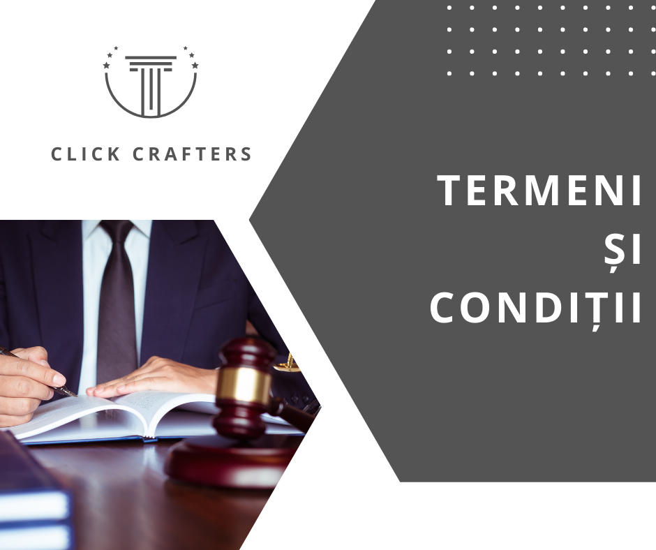 www.clickcrafters.ro(denumit în continuare „Termeni și Condiții”) și stabilește condițiile în care orice persoană poate accesa și utiliza conținutul site-ului, precum și condițiile care se aplică raporturilor juridice ce se nasc între www.clickcrafters.roși Utilizator, prin plasarea de către Utilizator a unei Comenzi în vederea achiziționării serviciilor furnizate de www.clickcrafters.ro Termenii și Condițiile de mai jos sunt aplicabile între părți și au valoarea unui acord între Utilizator și www.clickcrafters.rosau alte societăți asociate ori colaboratoare ale acesteia care identifică agentul economic (denumite în continuare „www.clickcrafters.ro”), www.clickcrafters.ro fiind proprietarul Site-ului.Orice utilizator al Site-ului are obligația, înainte de a vizita sau utiliza paginile Site-ului, să citească și să studieze cu atenție Termenii și Condițiile, precum și Politica privind protecția datelor cu caracter personal și de confidențialitate (denumită în continuare „Politica de confidențialitate) și Politica de utilizare a Cookie-urilor (denumită în continuare „Politica de cookies”).